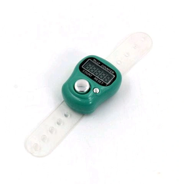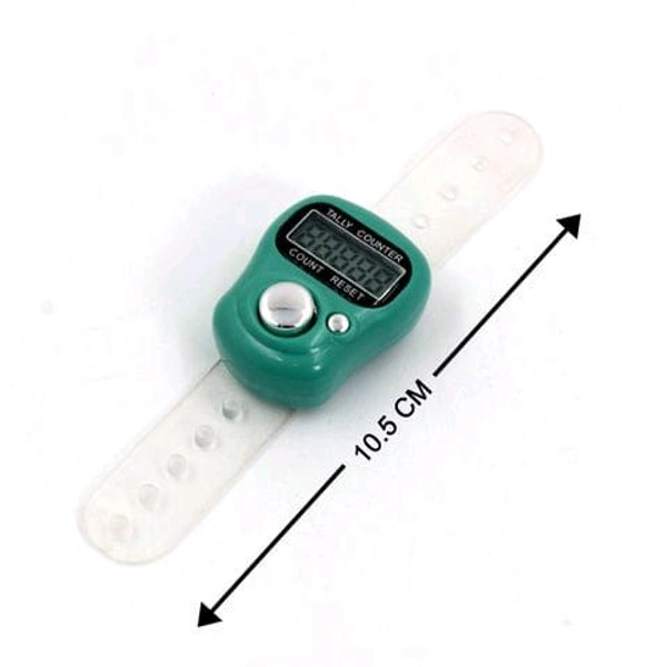 Digital Finger Tally Counter with LCD display, adjustable finger strap, and quick mechanical press reaction. Easy one-hand use, reset button to clear count, and auto power-saving function. Ideal for prayer, sports, inventory, and public place counting. Made of plastic. Color as per availability. Compact and lightweight design.